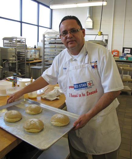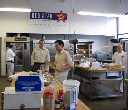 This is Roberto, one of the luckiest people I have ever met. He and Mark, who run the test kitchen at Red Star Yeast, have what I consider a dream job. They work in this amazing kitchen to come up with all kinds of yeasty treats. The equipment is top notch, the ingredients limitless and the space is massive. I have kitchen envy in a big way. No wonder they are such fantastically nice guys. They were kind enough to invite Jeff and me into their kitchen to play with them. We baked all kinds of breads from our books and did presentations to the rest of the Red Star team.